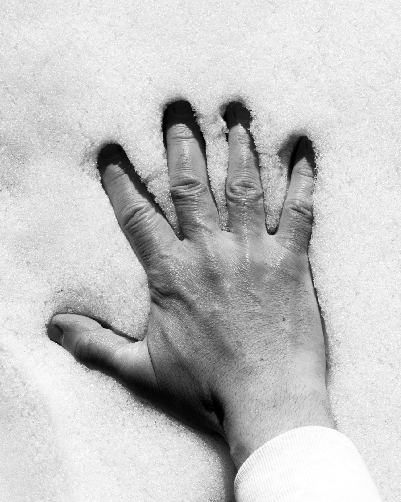 Steve Giasson. Performance invisible n° 289 (Laisser une marque (malgré tout)). Reenactment de Michal Kern. Prvý sneh, prvý dotyk, prvá stopa [Première neige, premier contact, première empreinte]. 1984. Performeur : Steve Giasson. Crédit photographique : Martin Vinette. Retouches photographiques : Charles-Étienne Lebrun. 21 février 2024.