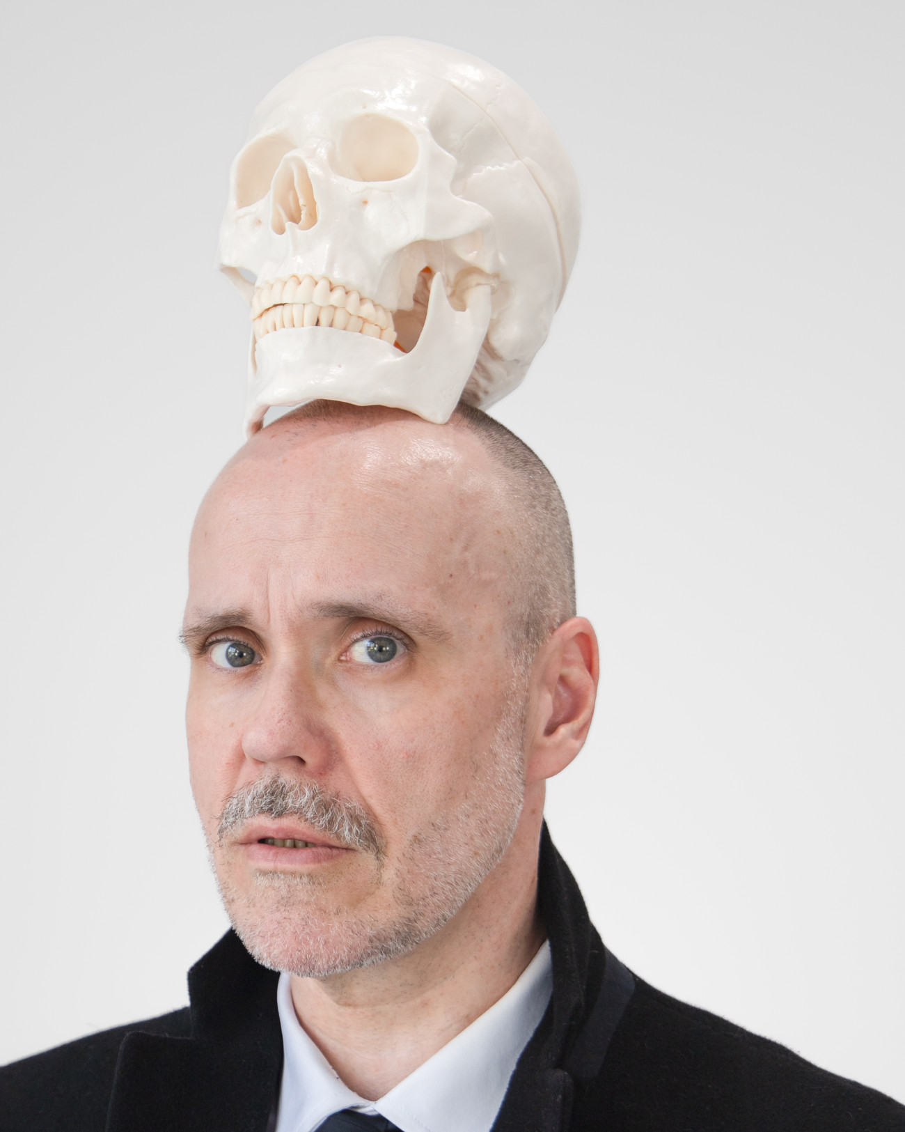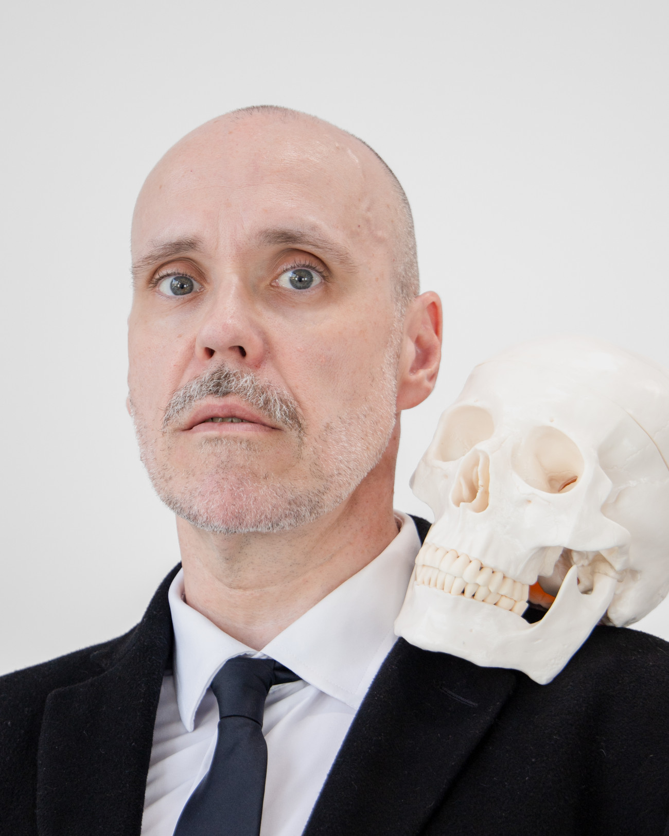 Steve Giasson. Performance invisible n° 294 (Regarder un désastre (au ralenti)). D'après Andy Warhol. Self-portrait with Skull. 1977. Performeurs : Steve Giasson et Martin Vinette. Crédit photographique : Martin Vinette. Retouches photographiques : Charles-Étienne Lebrun. Galerie B-312. 2 août 2025.