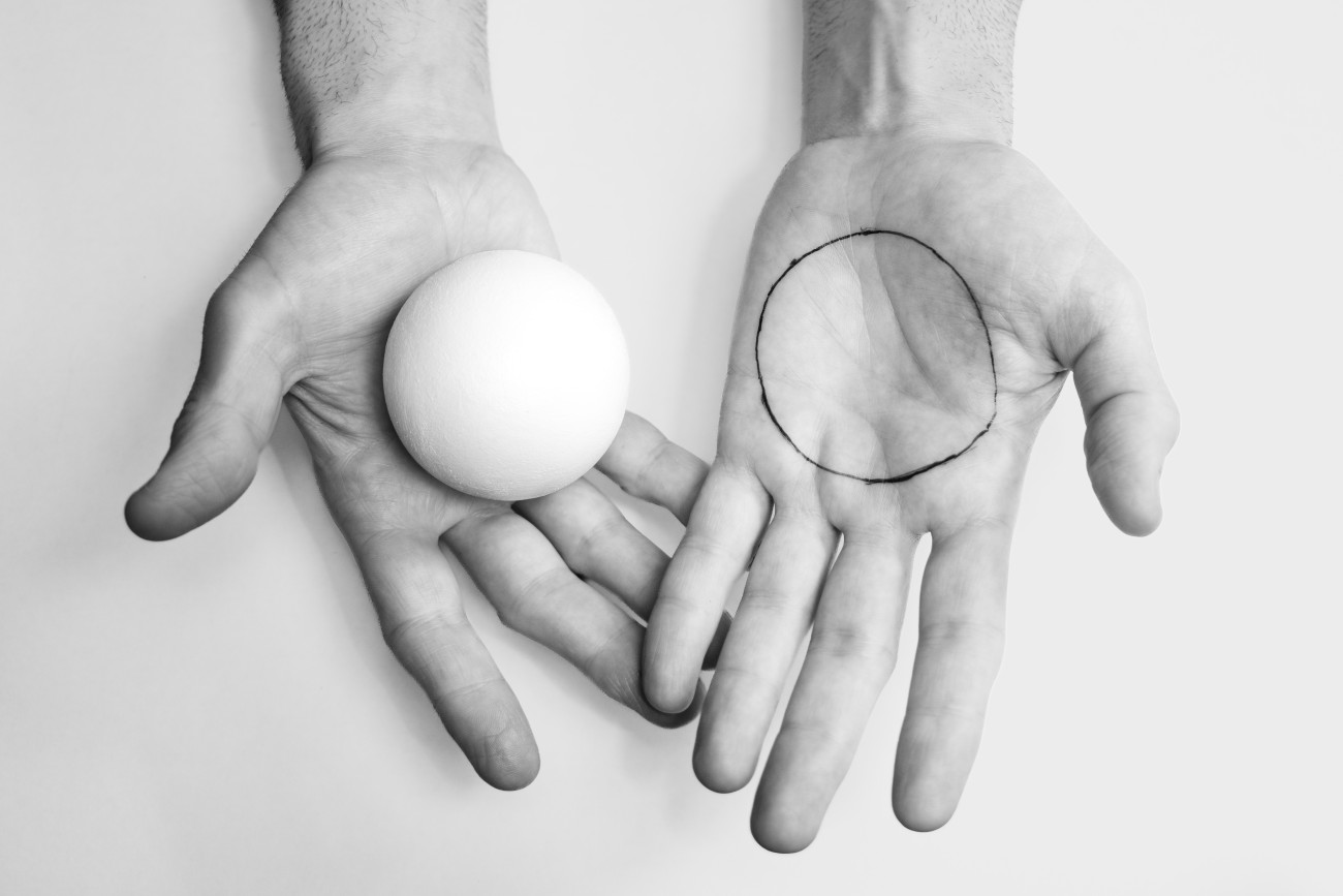 Steve Giasson. Performance invisible n° 287 (Chercher une autre forme). Reenactment de Liliana Porter. Untitled (geometric Shapes). 1973 . Performeur : Steve Giasson. Crédit photographique : Martin Vinette. Assistance : Félix Hould (formes géométriques). Retouches photographiques : Charles-Étienne Lebrun. 9 novembre 2025.