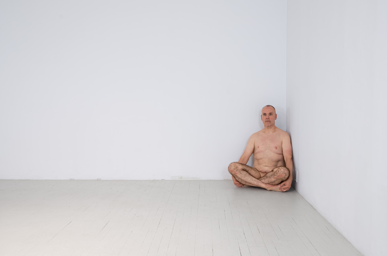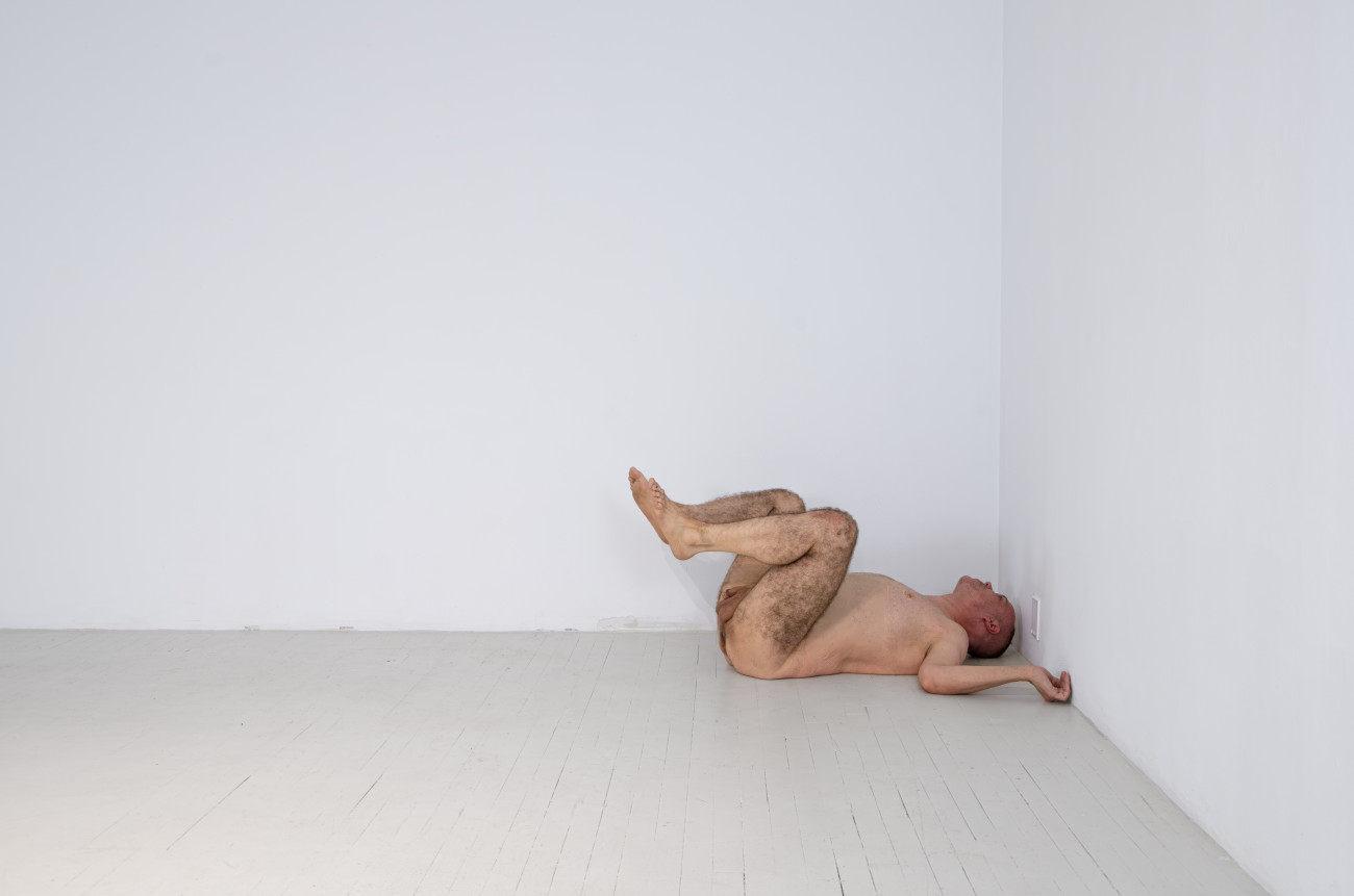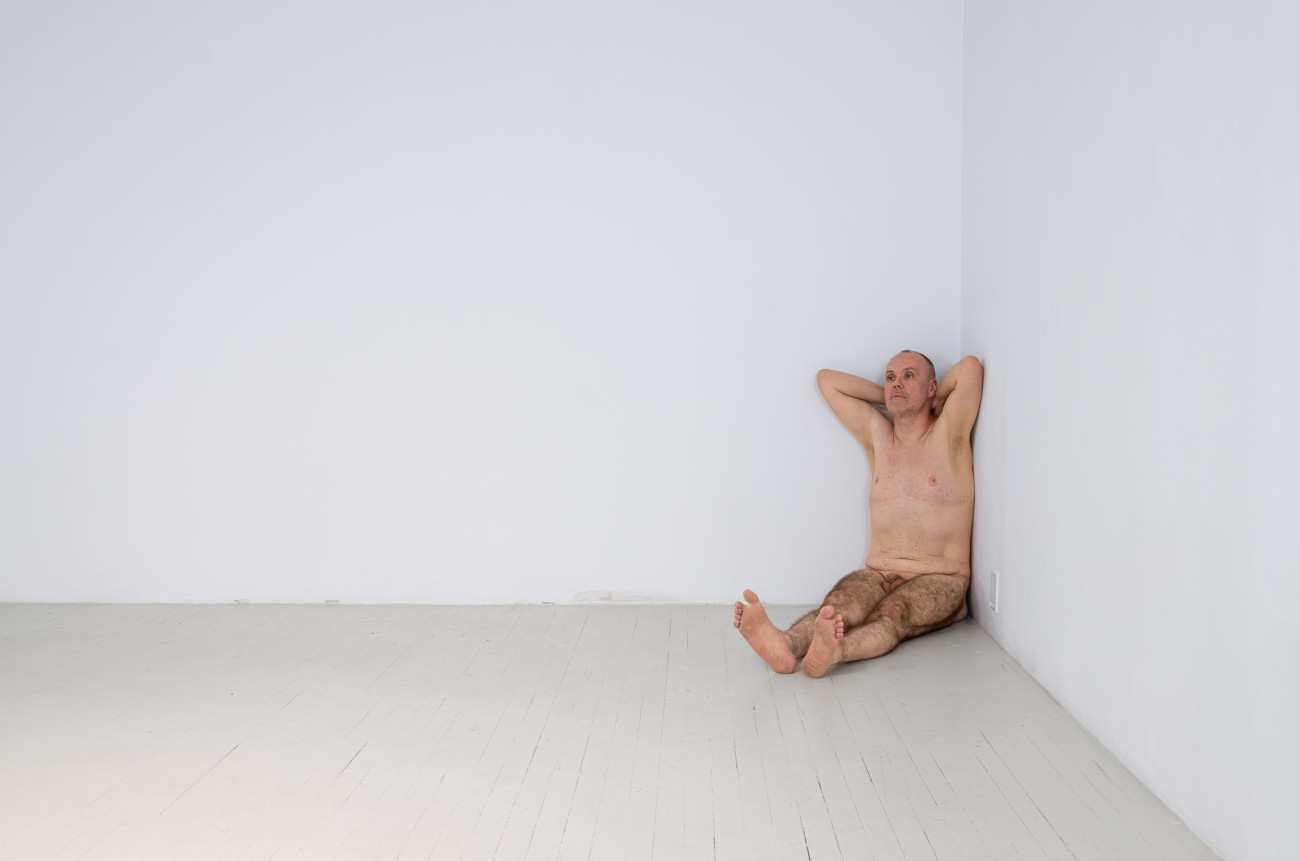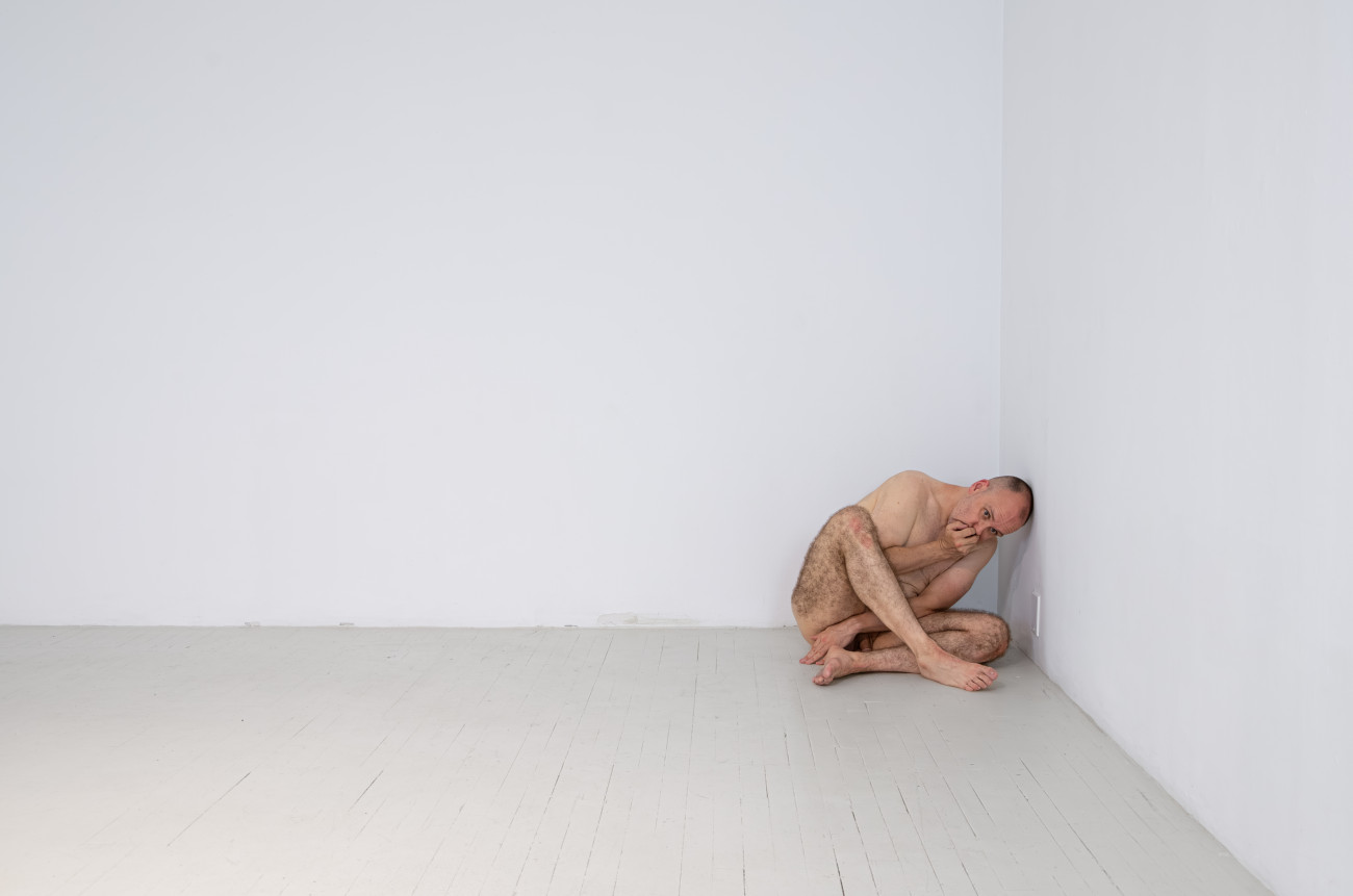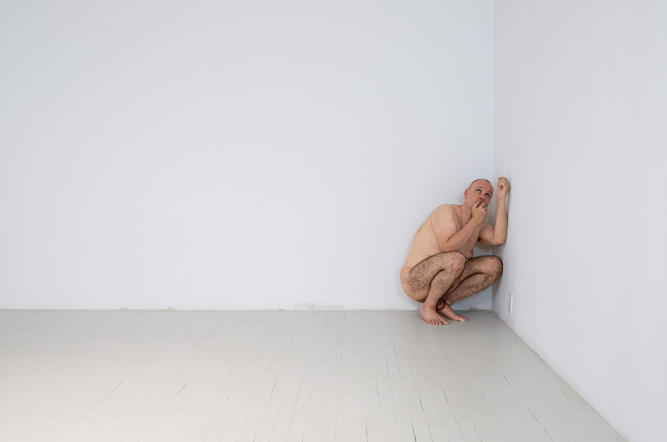 Steve Giasson. Performance invisible n° 261 (S'inventer des problèmes). Reenactment de Peter Weibel. Vulkanologie der Emotionen [Volcanologie des émotions]. 1971-1973. Performance : Steve Giasson. Crédit photographique : Martin Vinette. Retouches photographiques : Charles-Étienne Lebrun. Centre des arts actuels SKOL. 23 juillet 2024.