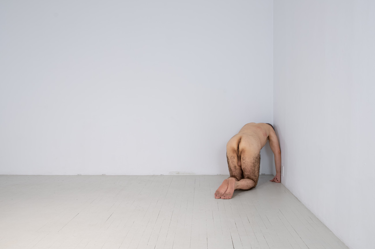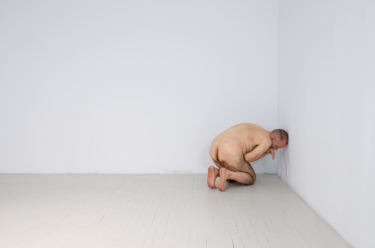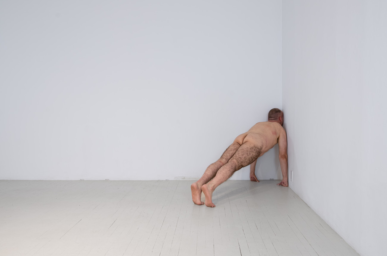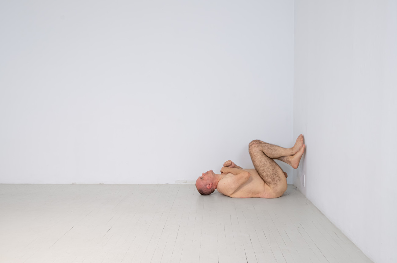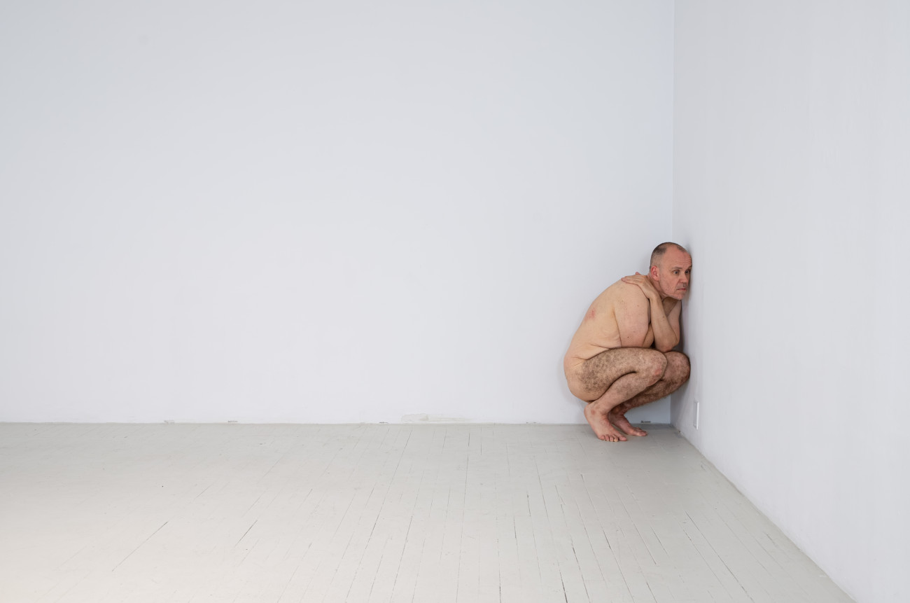Steve Giasson. Performance invisible n° 261 (S'inventer des problèmes). Reenactment de Peter Weibel. Vulkanologie der Emotionen [Volcanologie des émotions]. 1971-1973. Performance : Steve Giasson. Crédit photographique : Martin Vinette. Retouches photographiques : Charles-Étienne Lebrun. Centre des arts actuels SKOL. 23 juillet 2024.