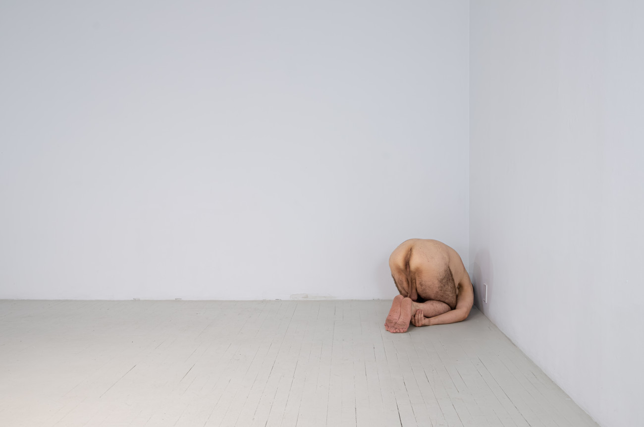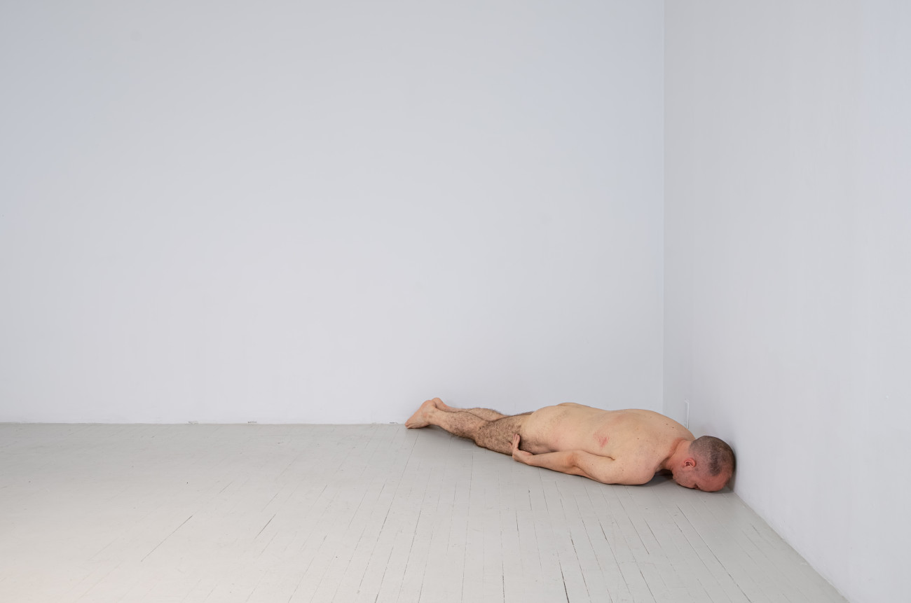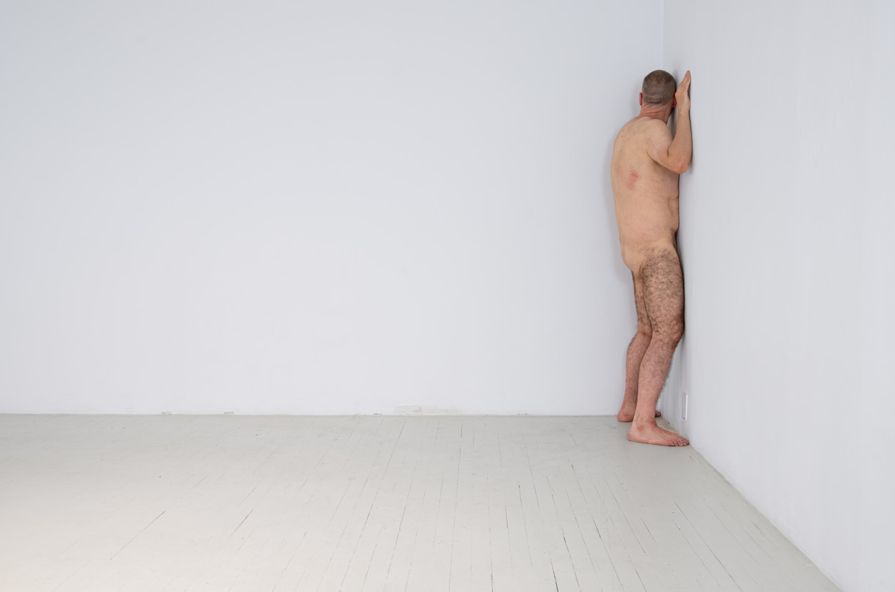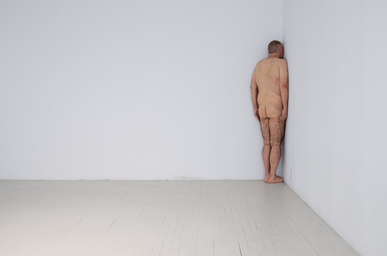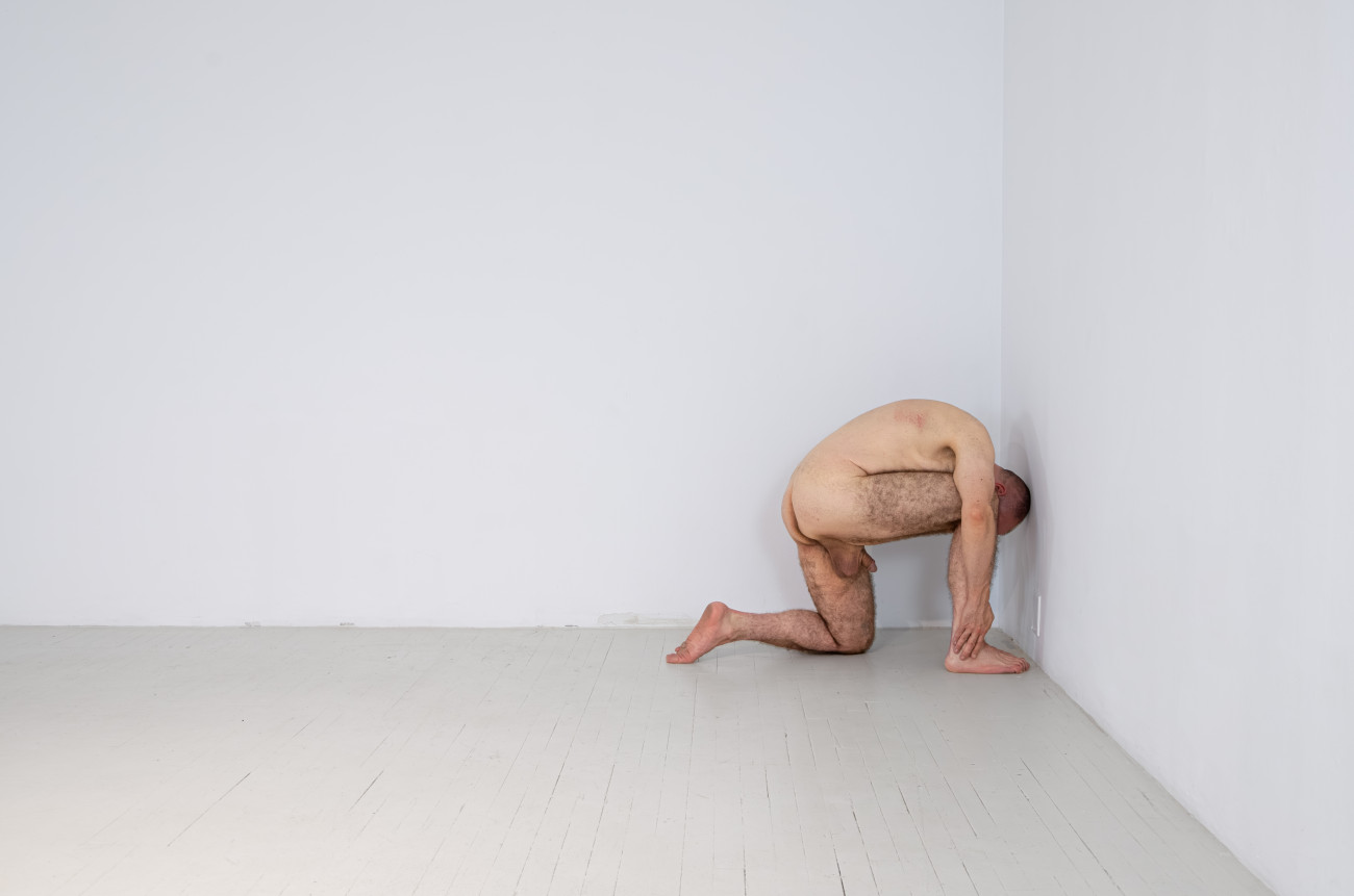 Steve Giasson. Performance invisible n° 261 (S'inventer des problèmes). Reenactment de Peter Weibel. Vulkanologie der Emotionen [Volcanologie des émotions]. 1971-1973. Performance : Steve Giasson. Crédit photographique : Martin Vinette. Retouches photographiques : Charles-Étienne Lebrun. Centre des arts actuels SKOL. 23 juillet 2024.