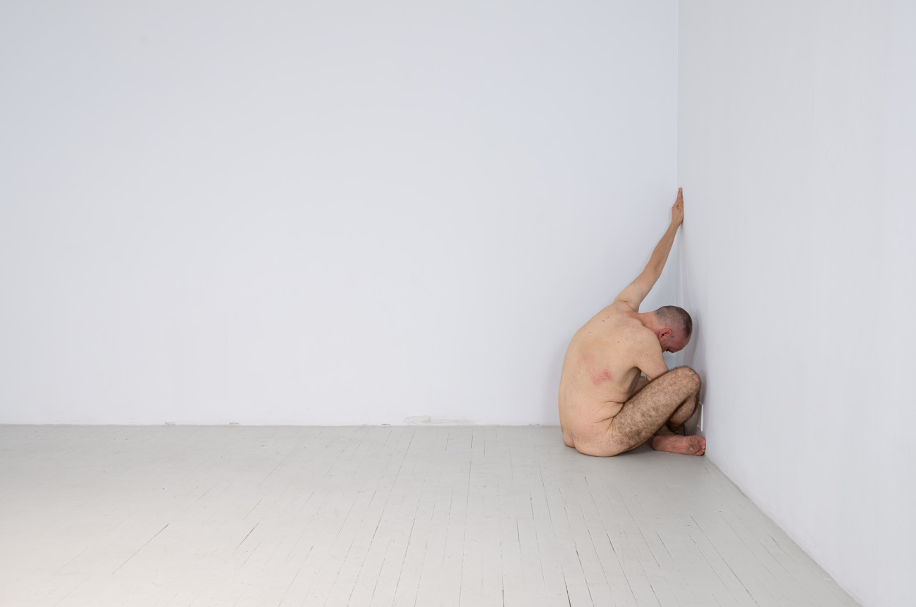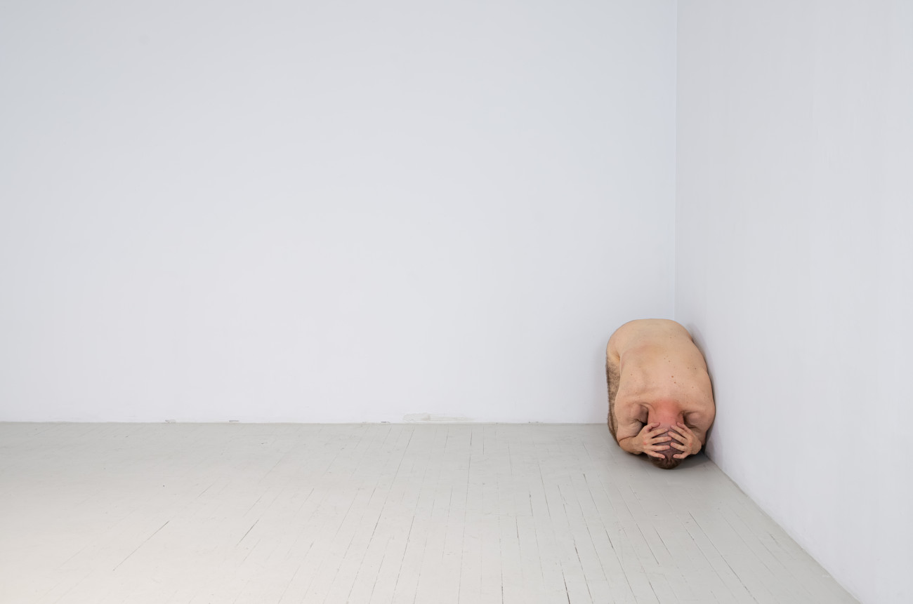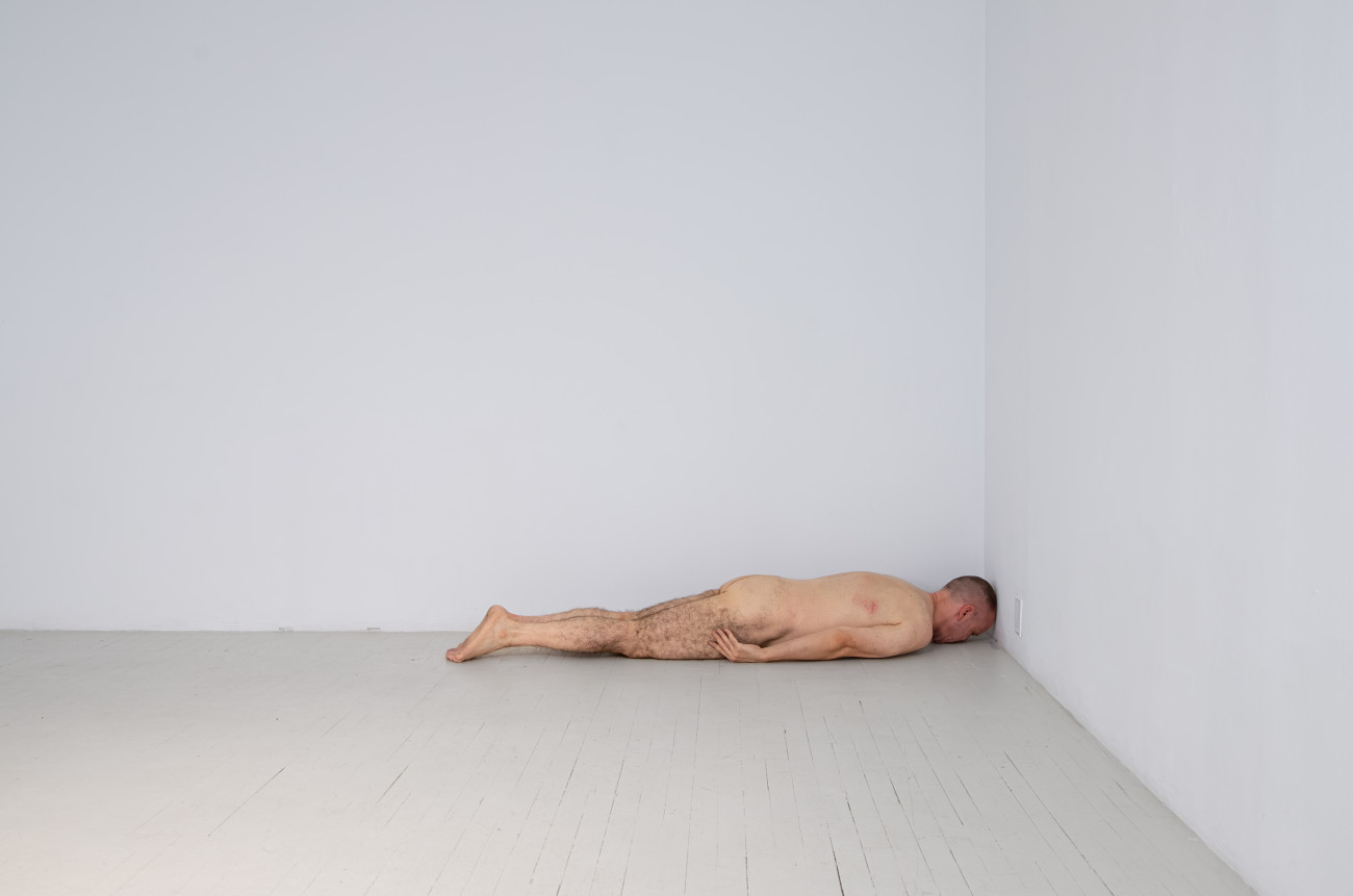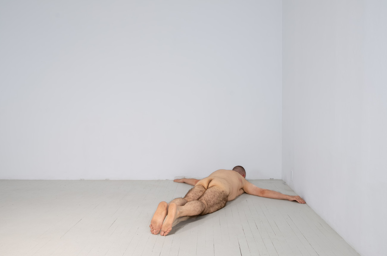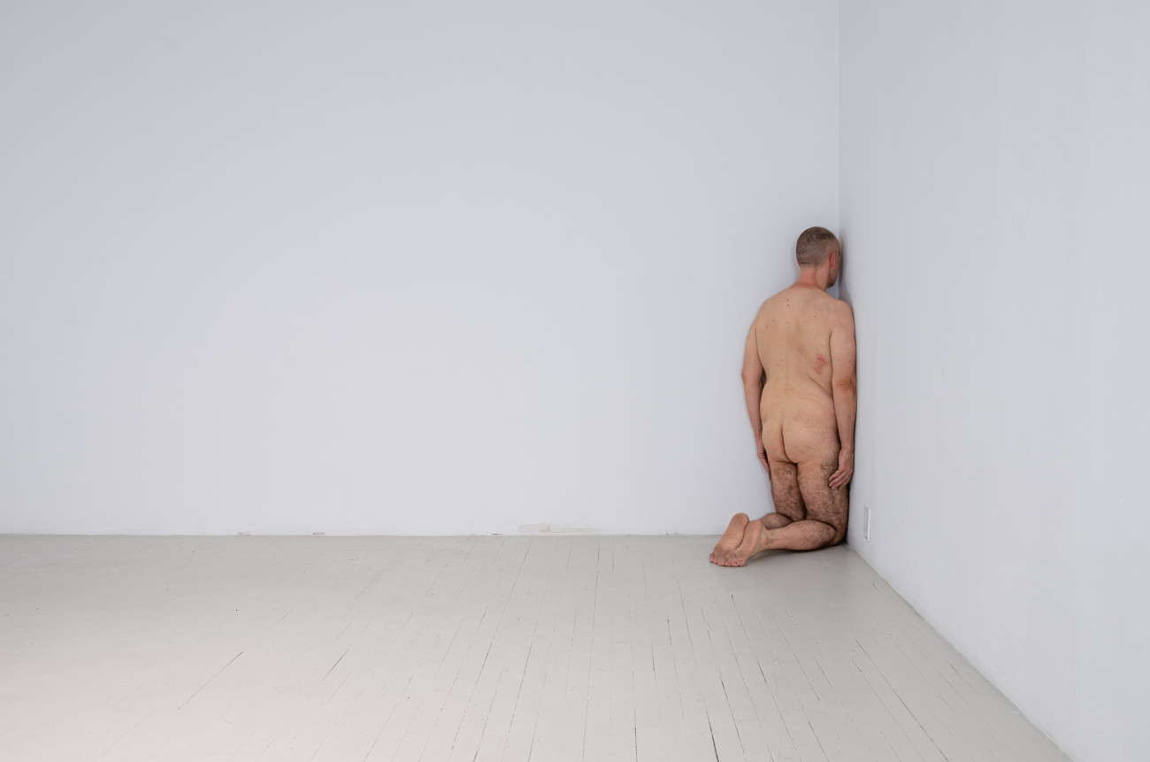 Steve Giasson. Performance invisible n° 261 (S'inventer des problèmes). Reenactment de Peter Weibel. Vulkanologie der Emotionen [Volcanologie des émotions]. 1971-1973. Performance : Steve Giasson. Crédit photographique : Martin Vinette. Retouches photographiques : Charles-Étienne Lebrun. Centre des arts actuels SKOL. 23 juillet 2024.