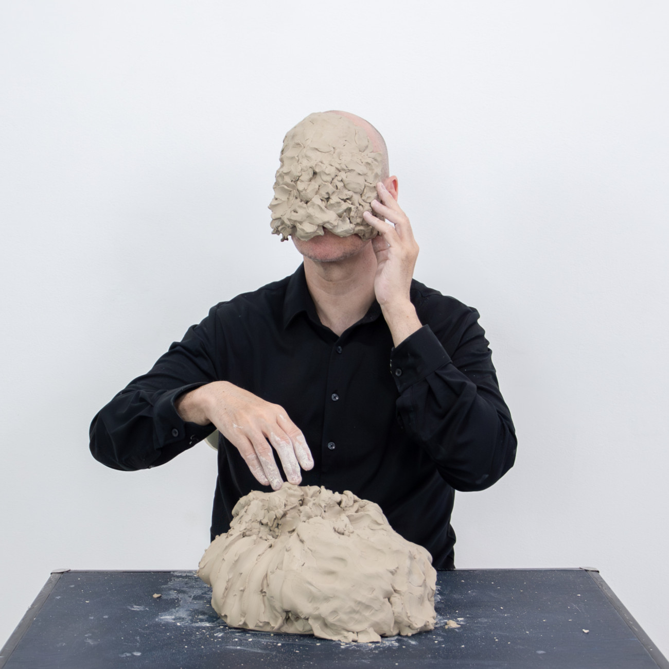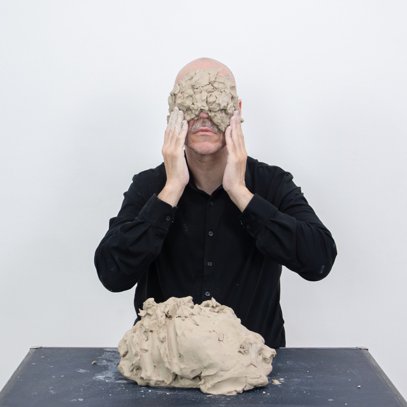 Steve Giasson. Performance invisible n° 254 (Changer de visage). Reenactment de Eliseo Mattiacci. Rifarsi. 1973. Performeur : Steve Giasson. Crédit photographique : Martin Vinette. Assistance : Félix Hould. Retouches photographiques : Charles-Étienne Lebrun. Galerie B-312. 17 août 2025.