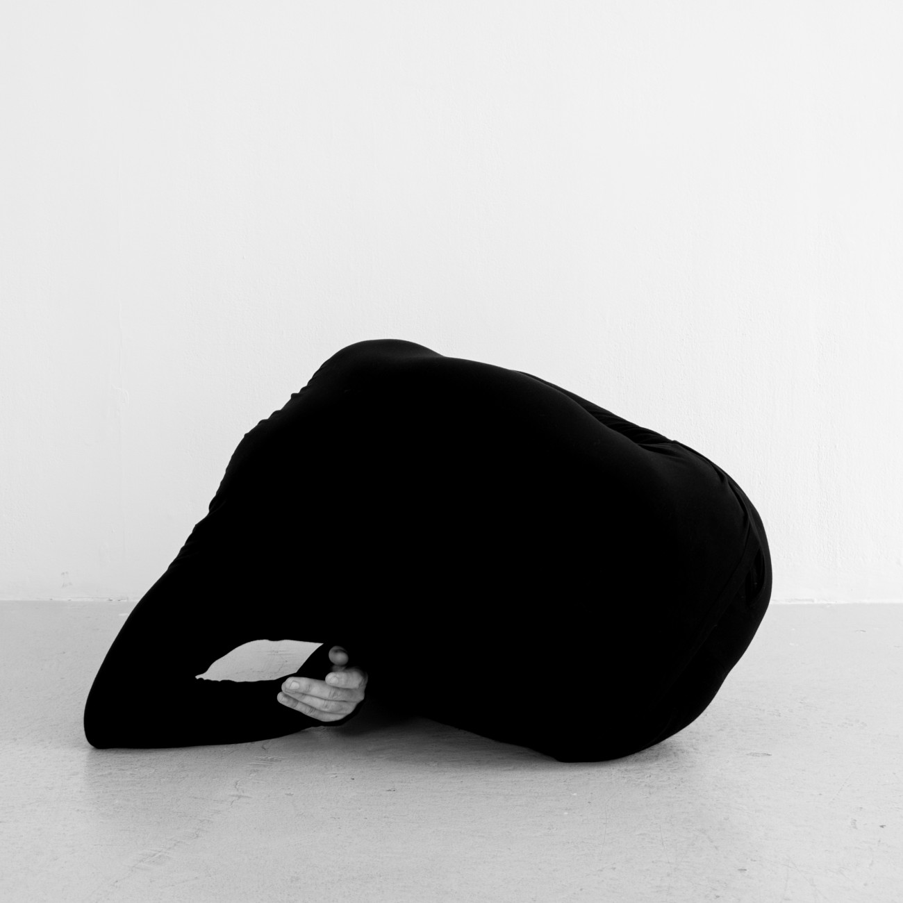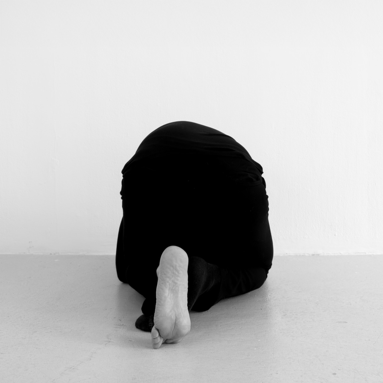 Steve Giasson. Performance invisible n° 275 (Vouloir être connu / Vouloir se faire oublier). Reenactment de Helena Almeida, Sem título [Sans titre], 2003. Performeur : Steve Giasson. Crédit photographique : Martin Vinette. Retouches photographiques : Charles-Étienne Lebrun. Galerie B-312. 10 août 2025.