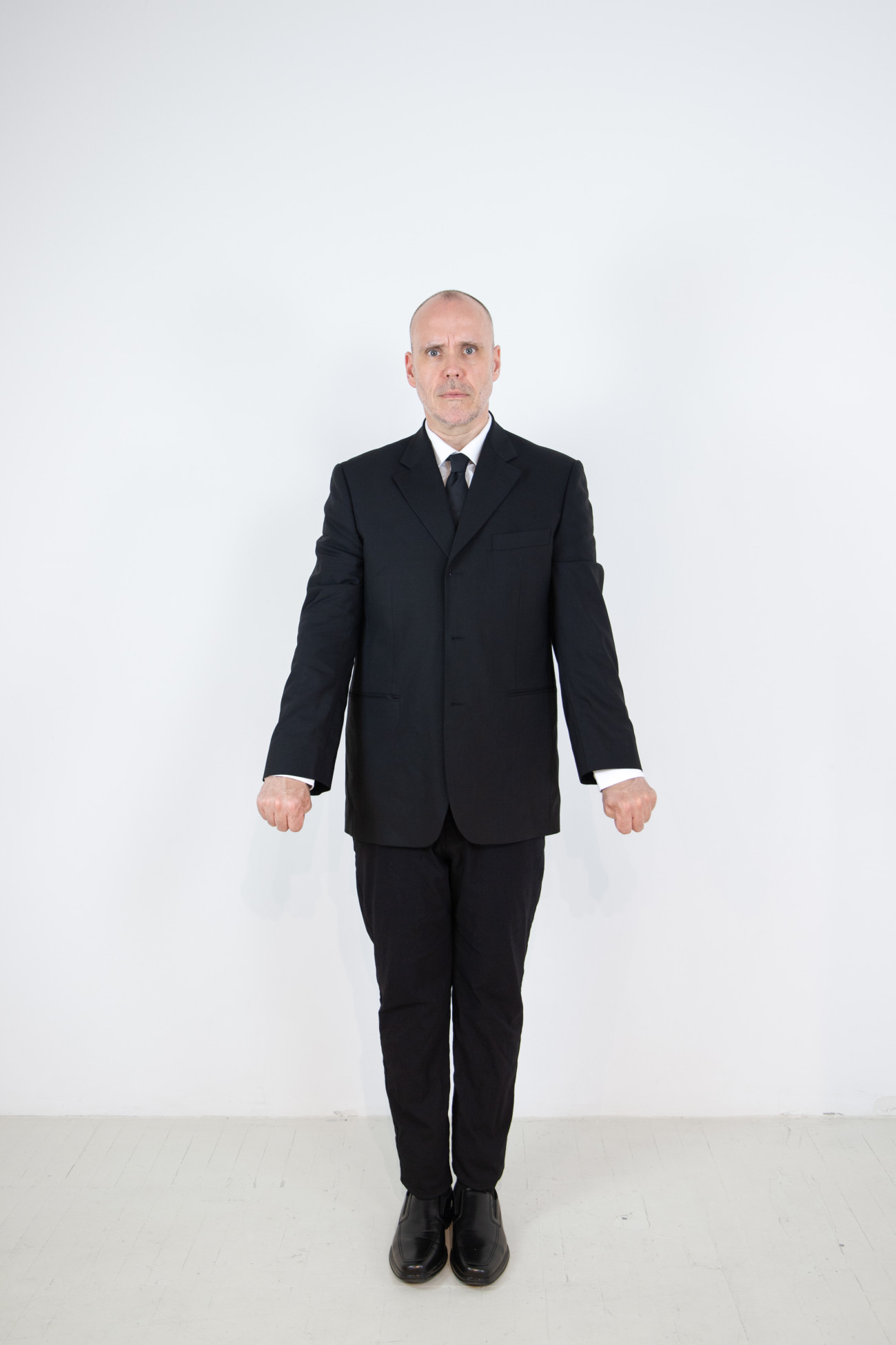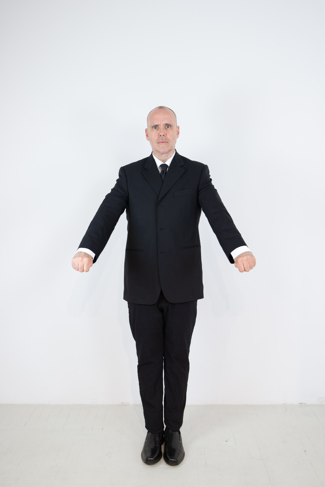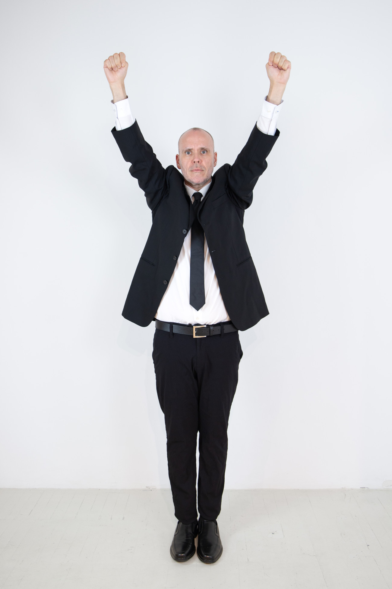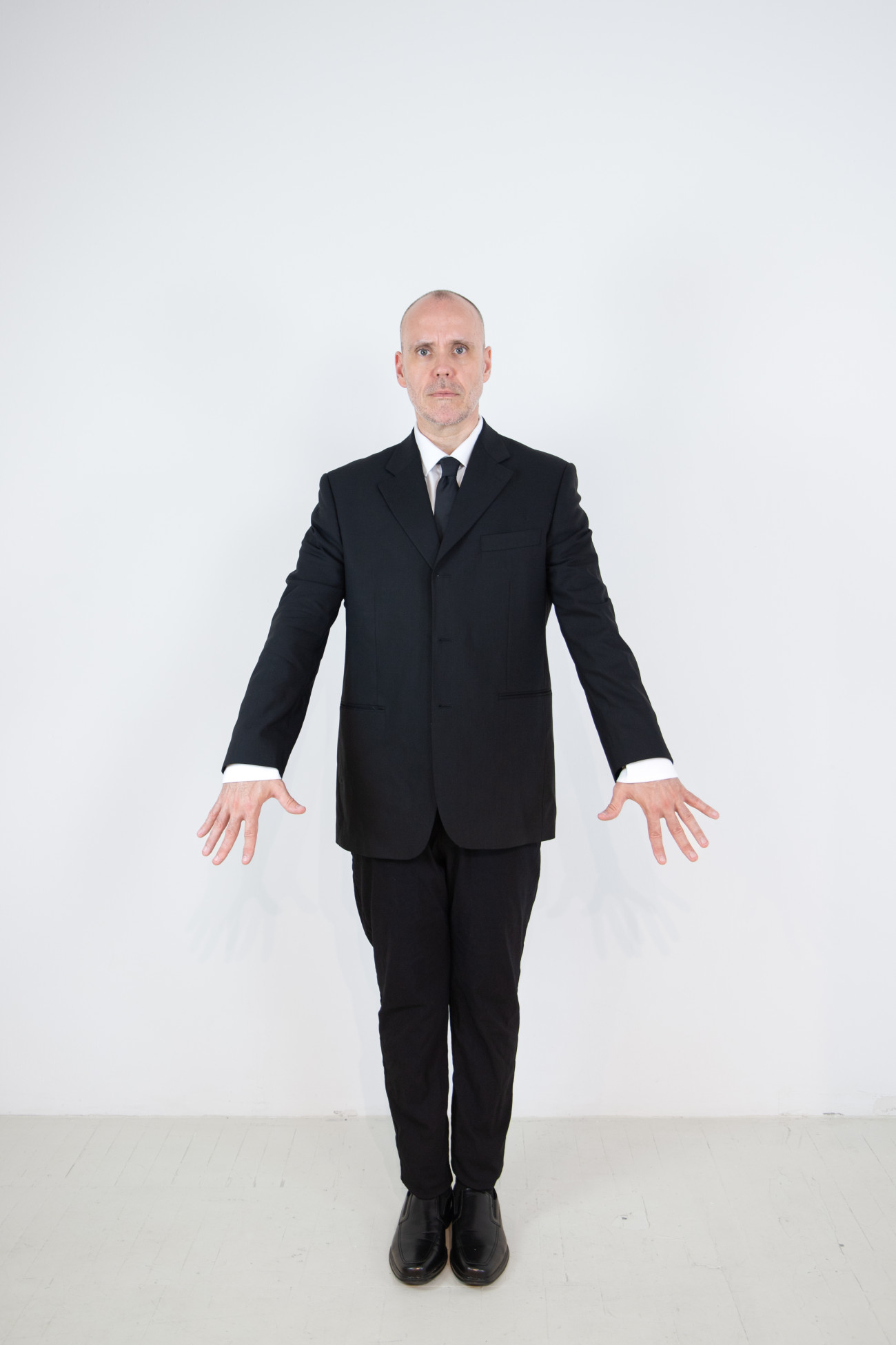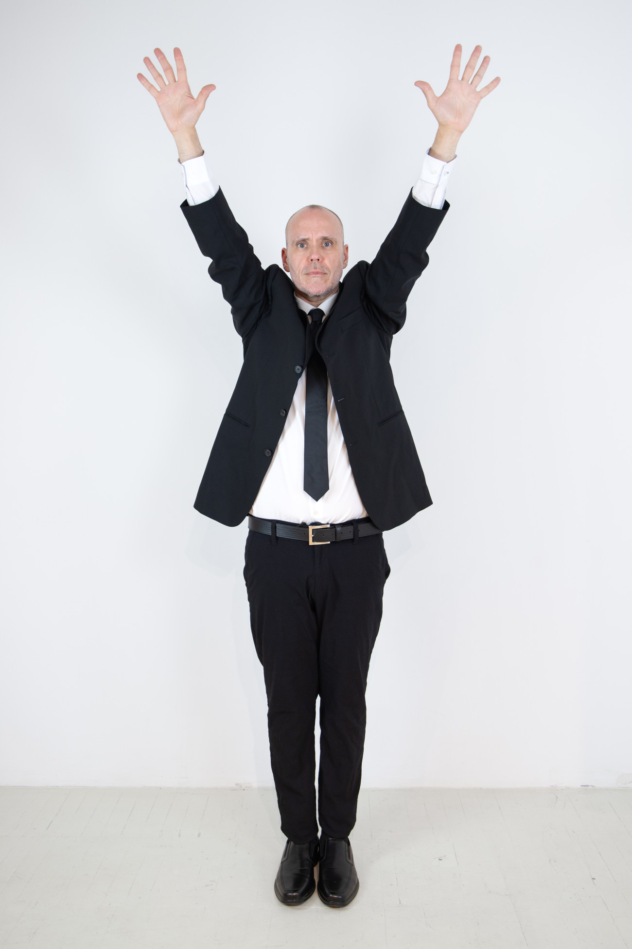Steve Giasson. Performance invisible n° 262 (Signaler sa présence). Reenactment de Walter Marchetti. Alzar los brazos. 1965. Performeur : Steve Giasson. Crédit photographique : Martin Vinette. Retouches photographiques : Charles-Étienne Lebrun. Centre des arts actuels SKOL. 17 août 2024.