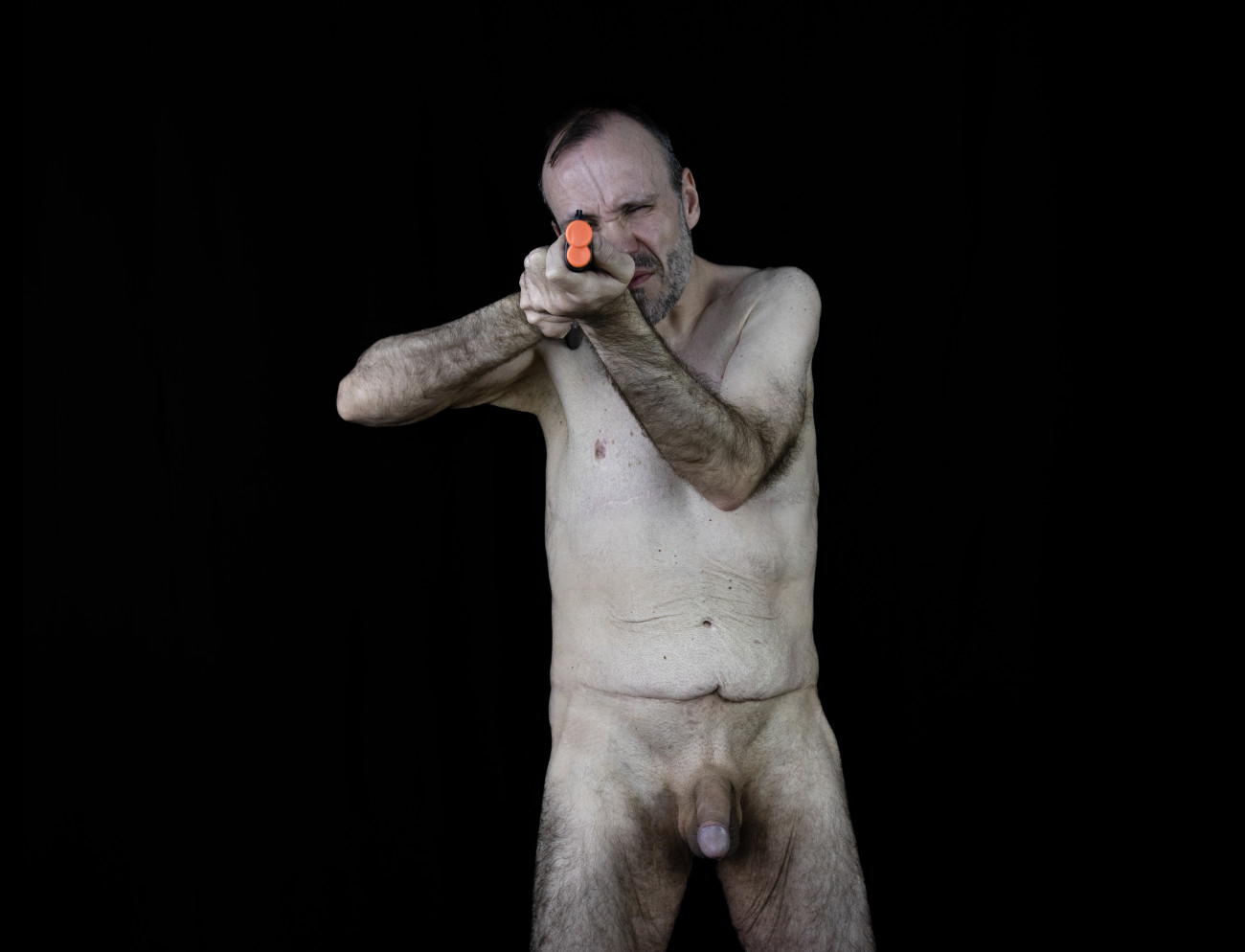 Steve Giasson. Performance invisible n° 292 (Soliloquer). Reenactment d'Ulay. Soliloquy (Shooting self). 1972-1973 (Amsterdam, September). Performeur : Steve Giasson. Crédit photographique : Martin Vinette. Retouches photographiques : Charles-Étienne Lebrun. 21 janvier 2021.